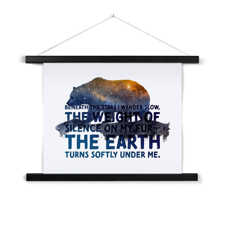 Dieser friedvolle Aquarellbär verkörpert stille Stärke unter dem Sternenhimmel. Das Gedicht lautet: „Unter den Sternen wandere ich langsam, die Stille lastet auf meinem Fell – die Erde dreht sich sanft unter mir.“ Ein erdendes, von der Natur inspiriertes Bild für ein friedvolles Zuhause.