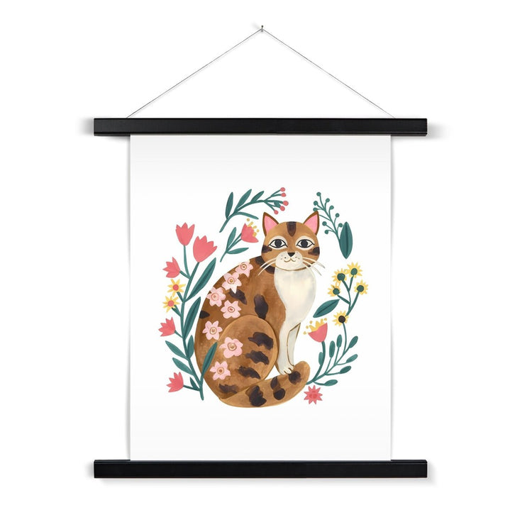 Dieses bezaubernde Stück zeigt eine charmante Katze, die mit zarten Blumen und Blättern geschmückt ist und so eine harmonische Mischung aus Laune und Eleganz schafft.