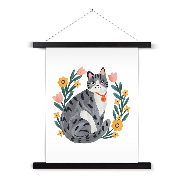 Werten Sie Ihre Inneneinrichtung mit dem Aquarell-Posterdruck „Purrfect Whiskers 12“ auf. Er zeigt eine bezaubernde Katze, geschmückt mit einem leuchtenden Blumenkranz und einem auffälligen roten Halsband.
