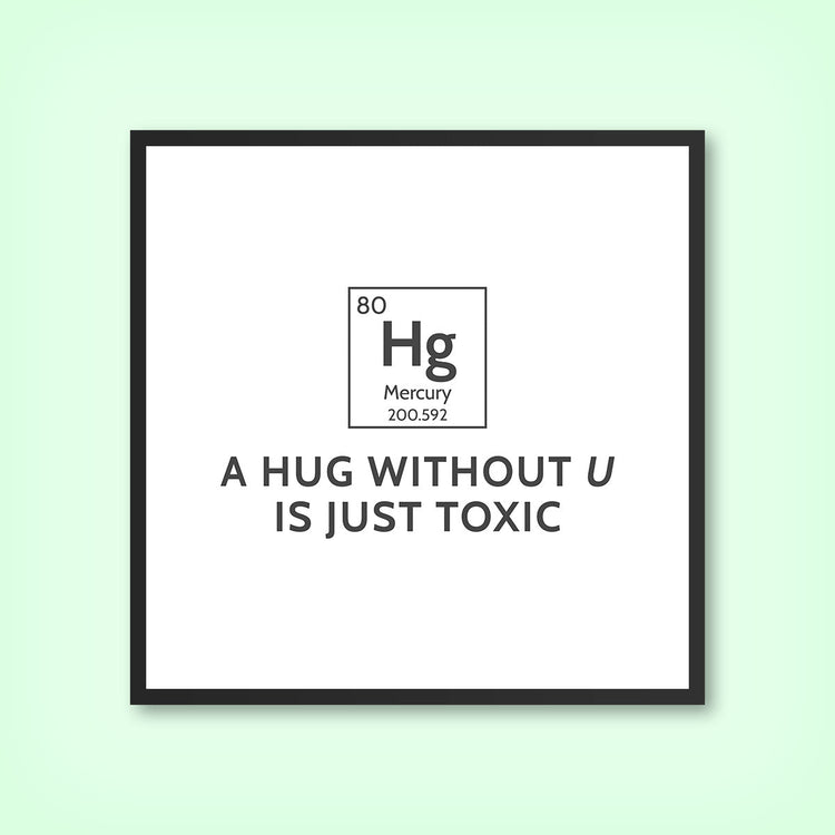 Verschönern Sie Ihre Wand (und Ihre Stimmung) mit dieser witzigen Kunstfliese mit Chemie-Wortspiel. Sie zeigt das Quecksilbersymbol (Hg) aus dem Periodensystem und erinnert auf humorvolle Weise daran, dass „Eine Umarmung ohne dich einfach nur Gift ist“.