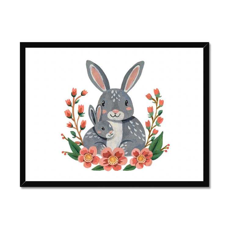 Esta encantadora imagen presenta un adorable conejito junto a un conejo bebé, ambos ubicados en medio de una vibrante variedad de flores.