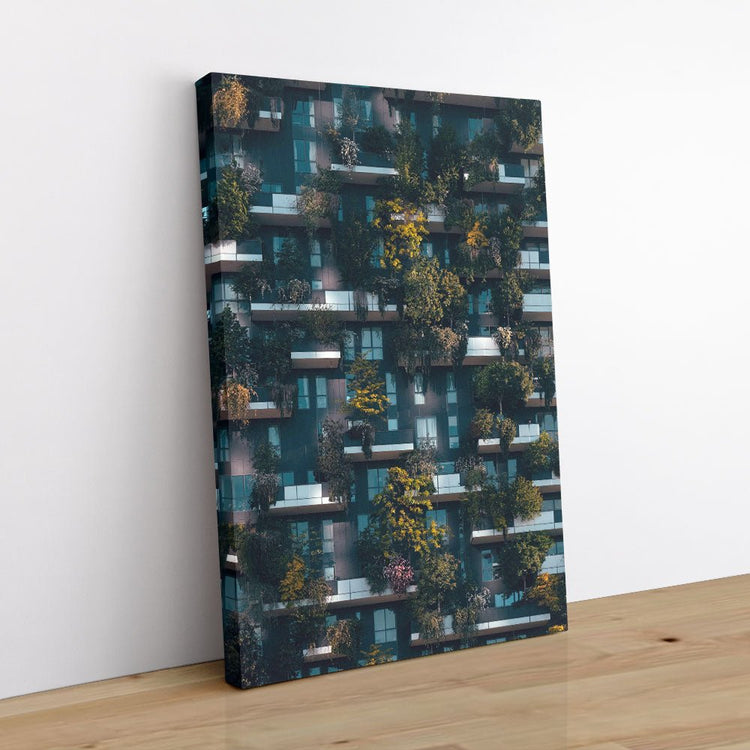 Immerse yourself in the lush imagery of trees, plants, and a captivating building, expertly printed on a premium canvas, guaranteeing an unrivaled level of quality.