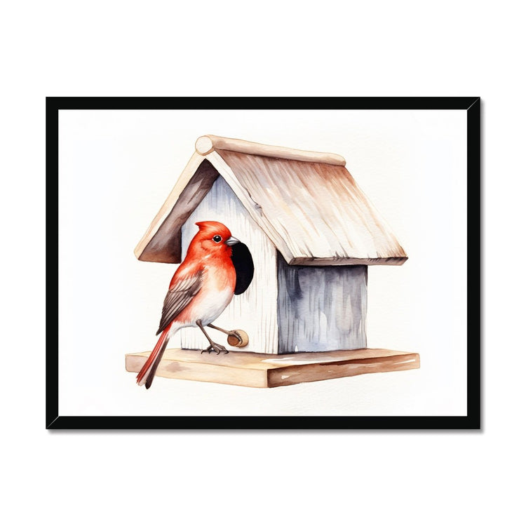 Elevate your home décor with this stunning poster print featuring a vibrant watercolor painting of a red bird perched gracefully on a charming birdhouse.