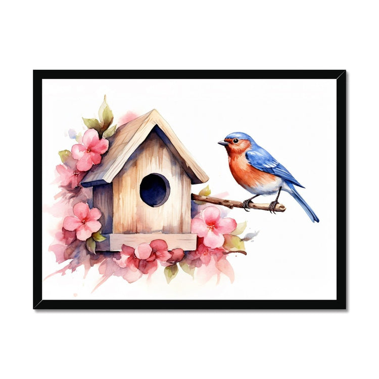 Elevate your home décor with this stunning watercolor poster print featuring a beautifully illustrated bird and a charming birdhouse.
